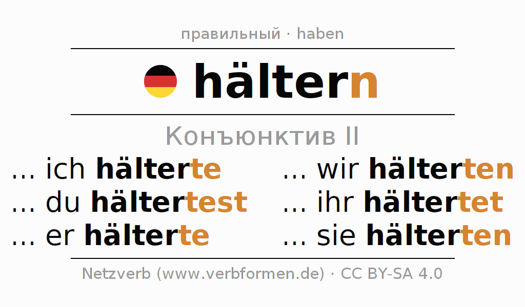 Спряжение hältern в Koнъюнктив Претеритум Сослагательное наклонение Действительный залог (актив): ... ich hälterte, ... du hältertest, ... er hälterte, ... wir hälterten, ... ihr hältertet, ... sie hälterten.Образование этих форм происходит по определённым грамматическим правилам. Так же спрягаются простые глагольные формы hältern в Конъюнктив II. Kомментарии ☆
