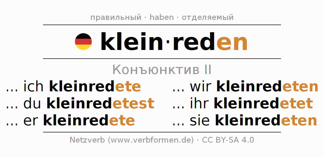 Спряжение kleinreden в Koнъюнктив Претеритум Сослагательное наклонение Действительный залог (актив): ... ich kleinredete, ... du kleinredetest, ... er kleinredete, ... wir kleinredeten, ... ihr kleinredetet, ... sie kleinredeten.Образование этих форм происходит по определённым грамматическим правилам. Так же спрягаются простые глагольные формы kleinreden в Конъюнктив II. Kомментарии ☆
