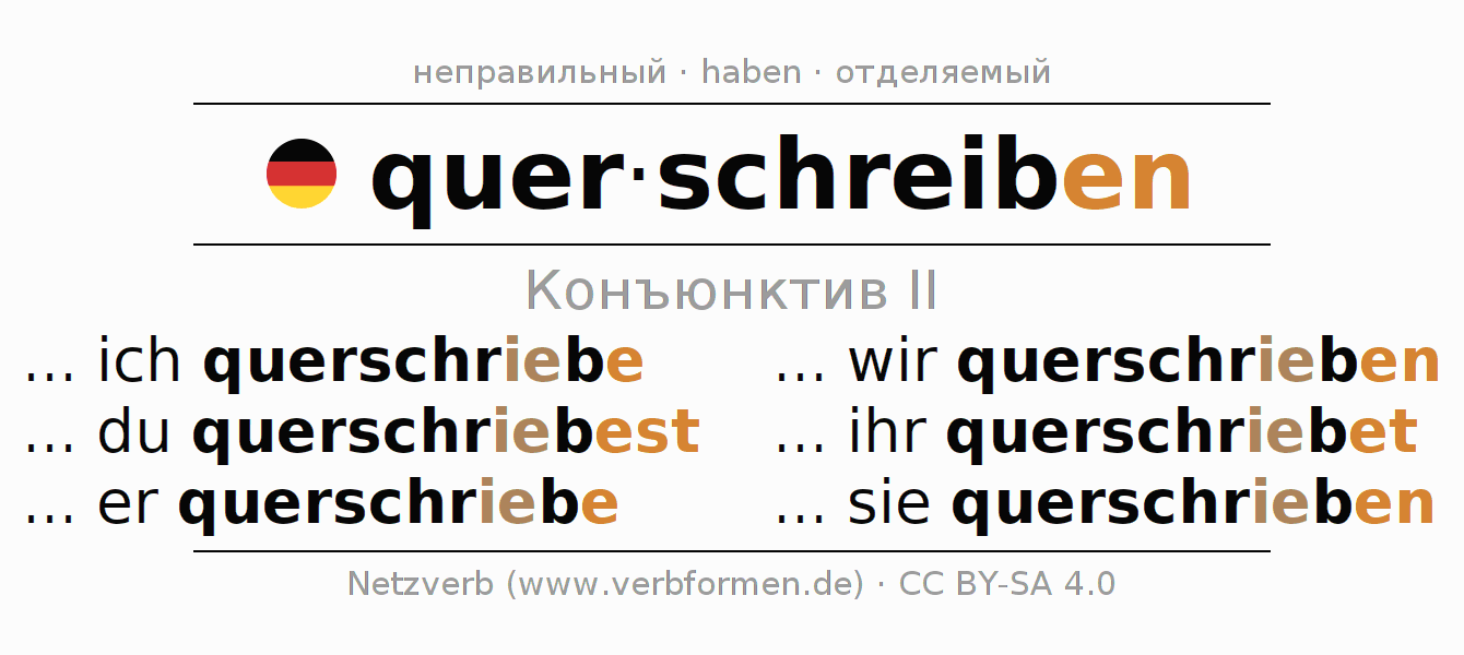 Спряжение querschreiben в Koнъюнктив Претеритум Сослагательное наклонение Действительный залог (актив): ... ich querschriebe, ... du querschriebest, ... er querschriebe, ... wir querschrieben, ... ihr querschriebet, ... sie querschrieben.Образование этих форм происходит по определённым грамматическим правилам. Так же спрягаются простые глагольные формы querschreiben в Конъюнктив II. Kомментарии ☆
