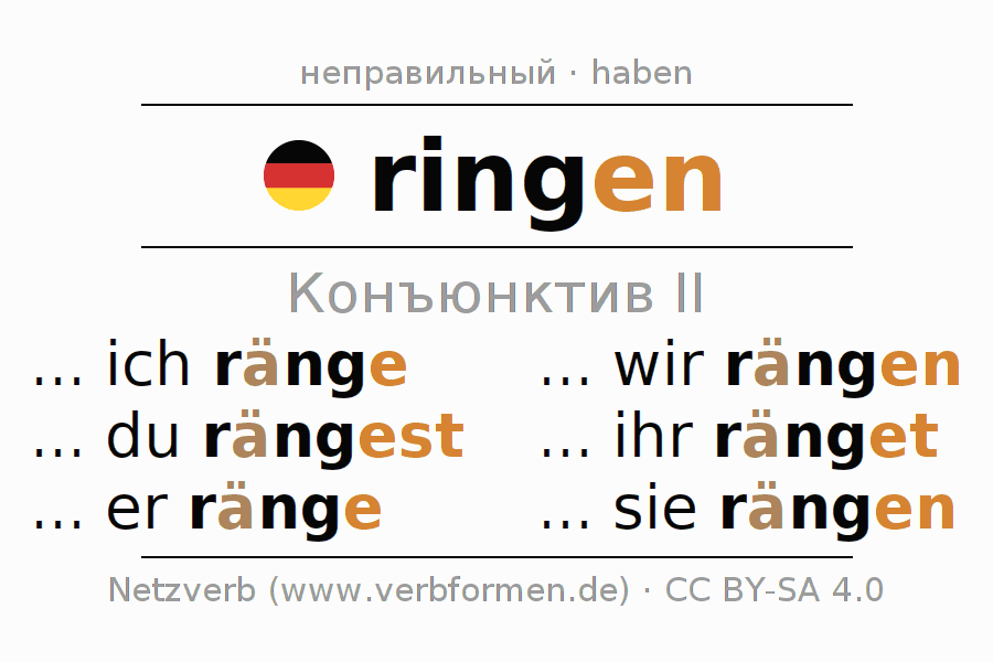 Спряжение ringen в Koнъюнктив Претеритум Сослагательное наклонение Действительный залог (актив): ... ich ränge, ... du rängest, ... er ränge, ... wir rängen, ... ihr ränget, ... sie rängen.Образование этих форм происходит по определённым грамматическим правилам. Так же спрягаются простые глагольные формы ringen в Конъюнктив II. Kомментарии ☆