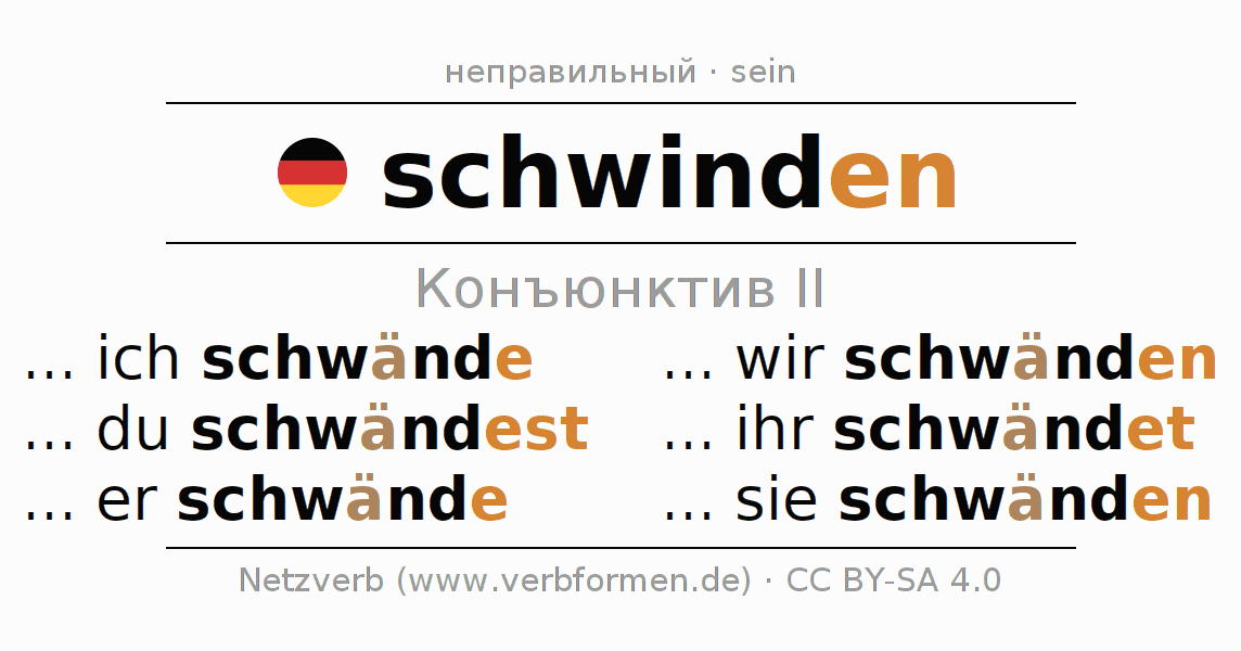 Спряжение schwinden в Koнъюнктив Претеритум Сослагательное наклонение Действительный залог (актив): ... ich schwände, ... du schwändest, ... er schwände, ... wir schwänden, ... ihr schwändet, ... sie schwänden.Образование этих форм происходит по определённым грамматическим правилам. Так же спрягаются простые глагольные формы schwinden в Конъюнктив II. Kомментарии ☆