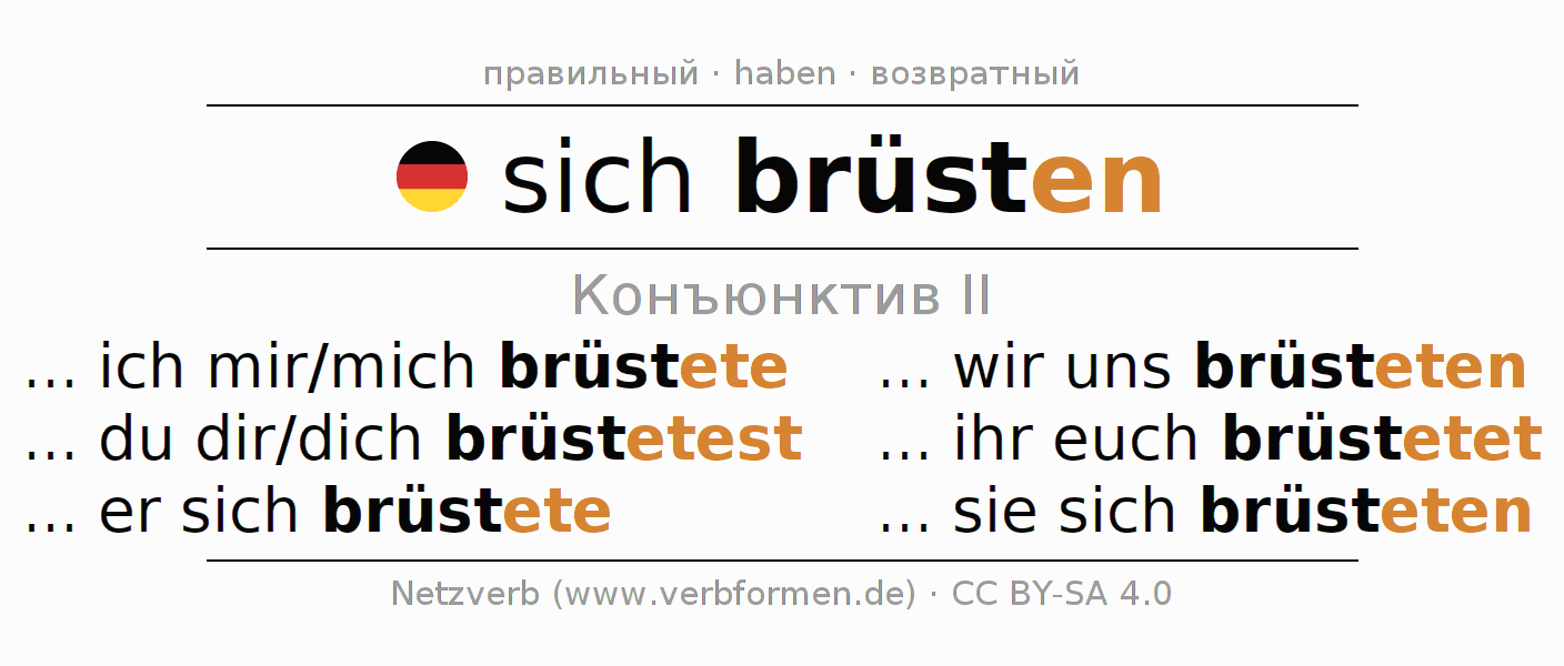 Спряжение sich brüsten в Koнъюнктив Претеритум Сослагательное наклонение Действительный залог (актив): ... ich mir/mich brüstete, ... du dir/dich brüstetest, ... er sich brüstete, ... wir uns brüsteten, ... ihr euch brüstetet, ... sie sich brüsteten.Образование этих форм происходит по определённым грамматическим правилам. Так же спрягаются простые глагольные формы brüsten в Конъюнктив II. Kомментарии ☆