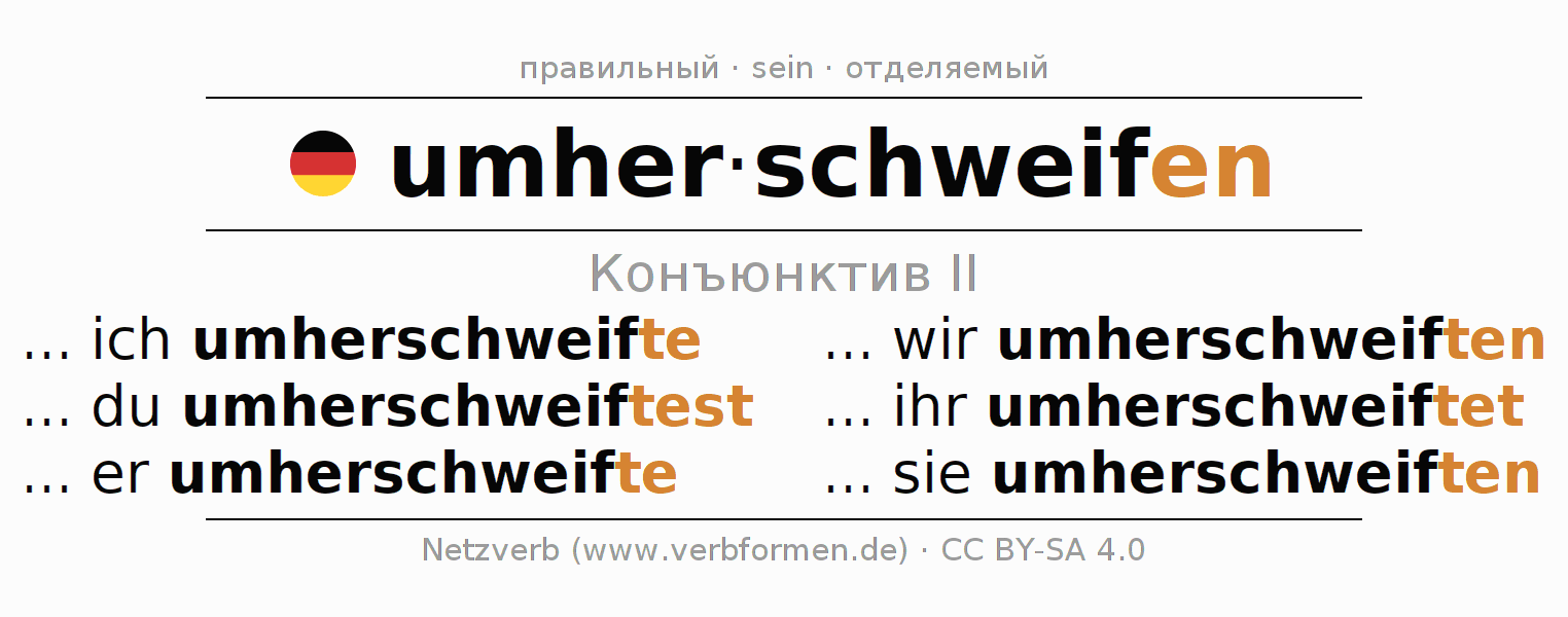 Спряжение umherschweifen в Koнъюнктив Претеритум Сослагательное наклонение Действительный залог (актив): ... ich umherschweifte, ... du umherschweiftest, ... er umherschweifte, ... wir umherschweiften, ... ihr umherschweiftet, ... sie umherschweiften.Образование этих форм происходит по определённым грамматическим правилам. Так же спрягаются простые глагольные формы umherschweifen в Конъюнктив II. Kомментарии ☆