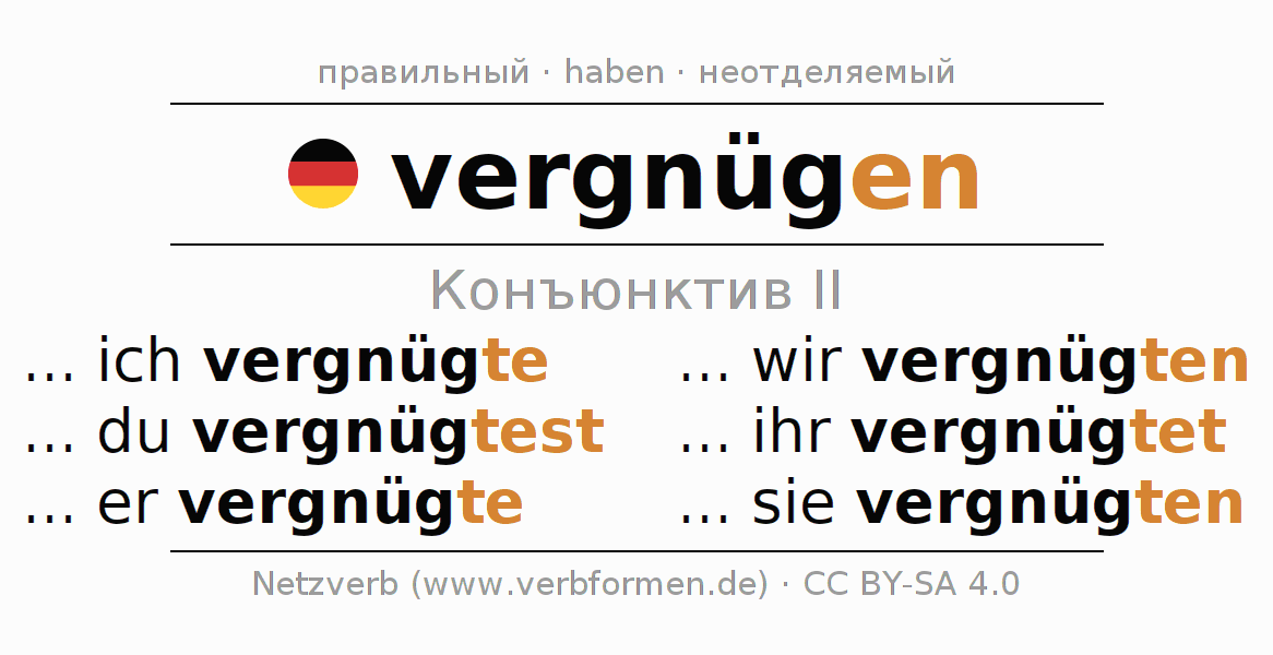 Спряжение vergnügen в Koнъюнктив Претеритум Сослагательное наклонение Действительный залог (актив): ... ich vergnügte, ... du vergnügtest, ... er vergnügte, ... wir vergnügten, ... ihr vergnügtet, ... sie vergnügten.Образование этих форм происходит по определённым грамматическим правилам. Так же спрягаются простые глагольные формы vergnügen в Конъюнктив II. Kомментарии ☆