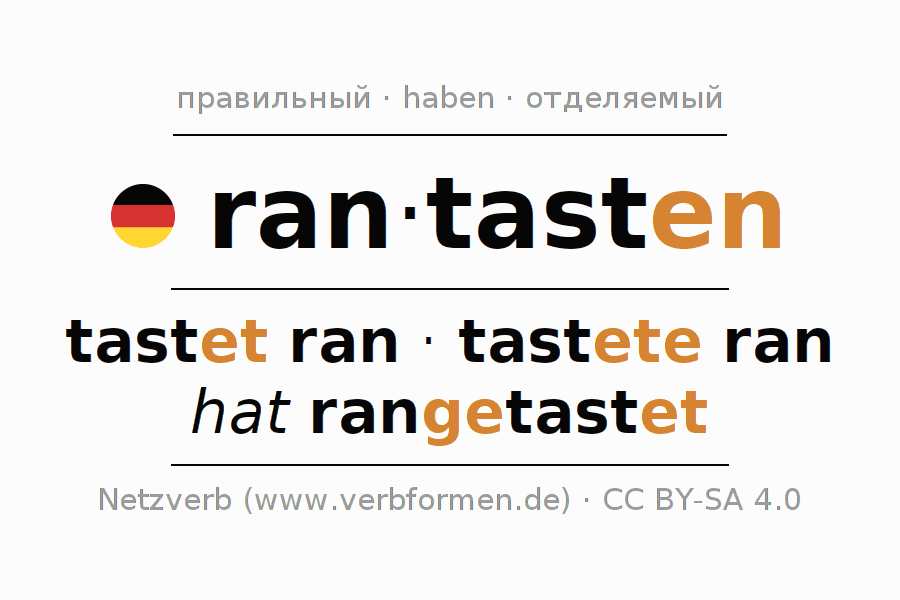 Спряжение rantasten (приближаться осторожно, прикасаться осторожно) в сослагательном наклонении II: ich tastete ran, du tastetest ran, er tastete ran, wir tasteten ran, ihr tastetet ran, sie tasteten ran