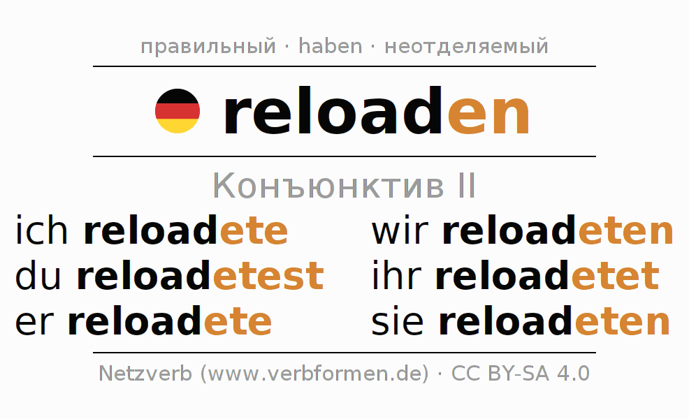 Спряжение reloaden (перезагрузить) в сослагательном наклонении II: ich reloadete, du reloadetest, er reloadete, wir reloadeten, ihr reloadetet, sie reloadeten