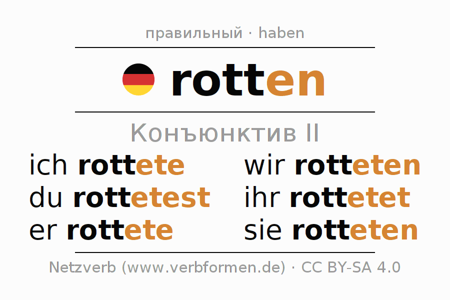 Спряжение rotten (группироваться, собираться) в сослагательном наклонении II: ich rottete, du rottetest, er rottete, wir rotteten, ihr rottetet, sie rotteten