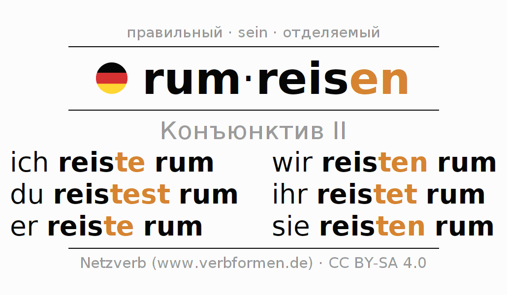 Спряжение rumreisen (блуждать, путешествовать без цели) в сослагательном наклонении II: ich reiste rum, du reistest rum, er reiste rum, wir reisten rum, ihr reistet rum, sie reisten rum