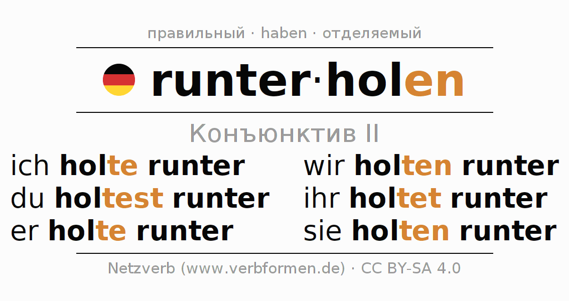 Спряжение runterholen (дрочить, опускать) в сослагательном наклонении II: ich holte runter, du holtest runter, er holte runter, wir holten runter, ihr holtet runter, sie holten runter