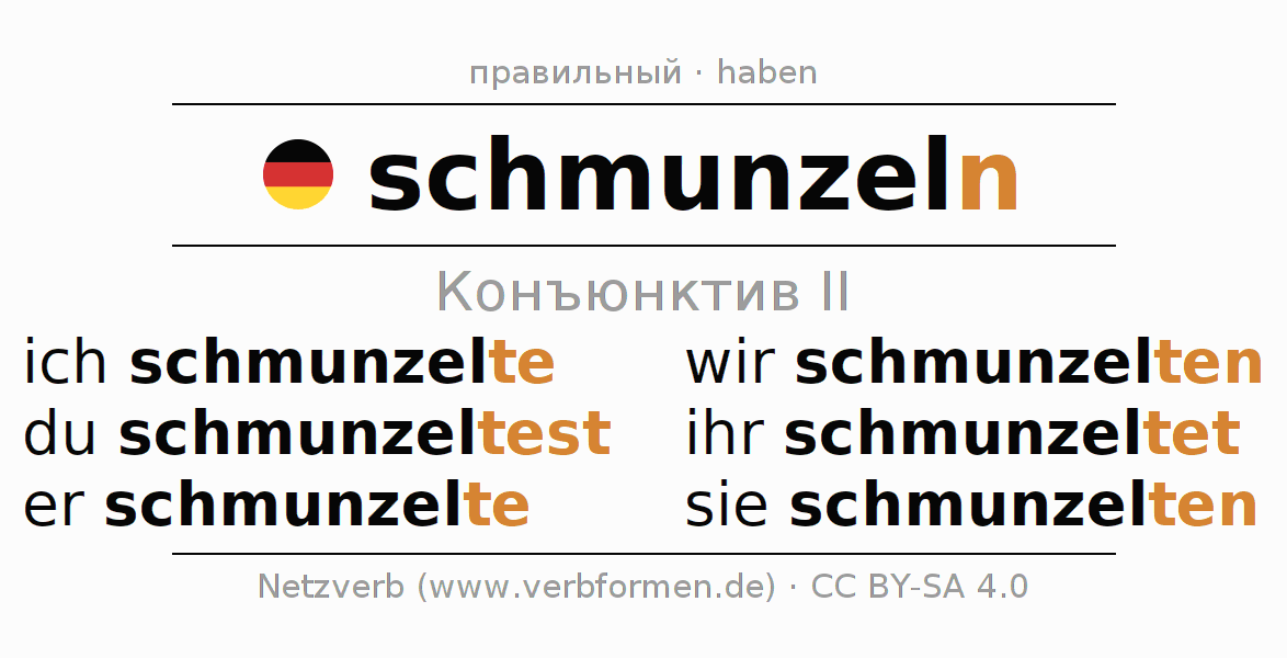 Спряжение schmunzeln (усмехаться, улыбаться) в сослагательном наклонении II: ich schmunzelte, du schmunzeltest, er schmunzelte, wir schmunzelten, ihr schmunzeltet, sie schmunzelten