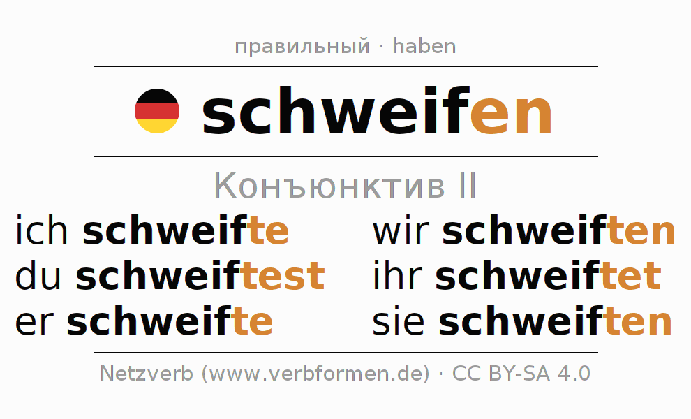 Спряжение schweifen (блуждать, бродить) в сослагательном наклонении II: ich schweifte, du schweiftest, er schweifte, wir schweiften, ihr schweiftet, sie schweiften
