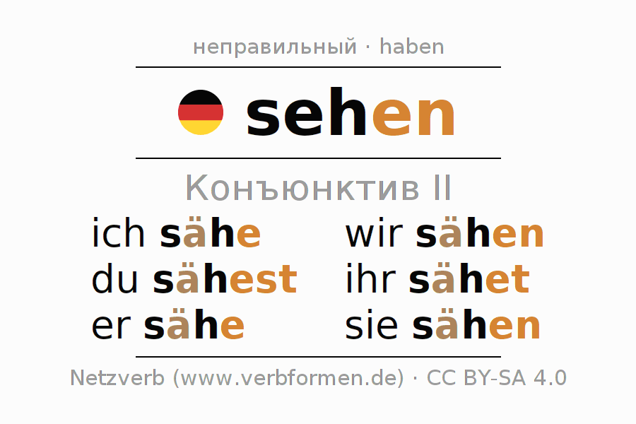 Спряжение sehen (смотреть, видеть) в сослагательном наклонении II: ich sähe, du sähest, er sähe, wir sähen, ihr sähet, sie sähen