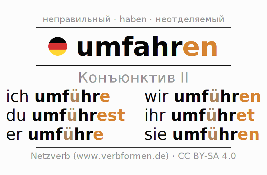 Спряжение umfahren (объезжать, обогнуть) в сослагательном наклонении II: ich umführe, du umführest, er umführe, wir umführen, ihr umführet, sie umführen