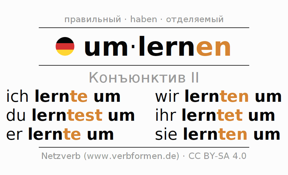 Спряжение umlernen (переучиваться, переучивание) в сослагательном наклонении II: ich lernte um, du lerntest um, er lernte um, wir lernten um, ihr lerntet um, sie lernten um