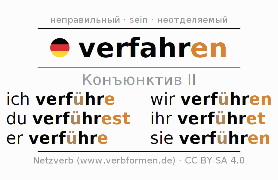 Спряжение verfahren (действовать, обойтись) в сослагательном наклонении II: ich verführe, du verführest, er verführe, wir verführen, ihr verführet, sie verführen