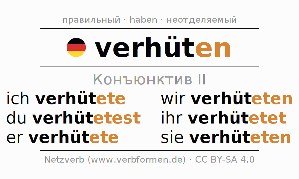 Спряжение verhüten (предотвращать, предупреждать) в сослагательном наклонении II: ich verhütete, du verhütetest, er verhütete, wir verhüteten, ihr verhütetet, sie verhüteten