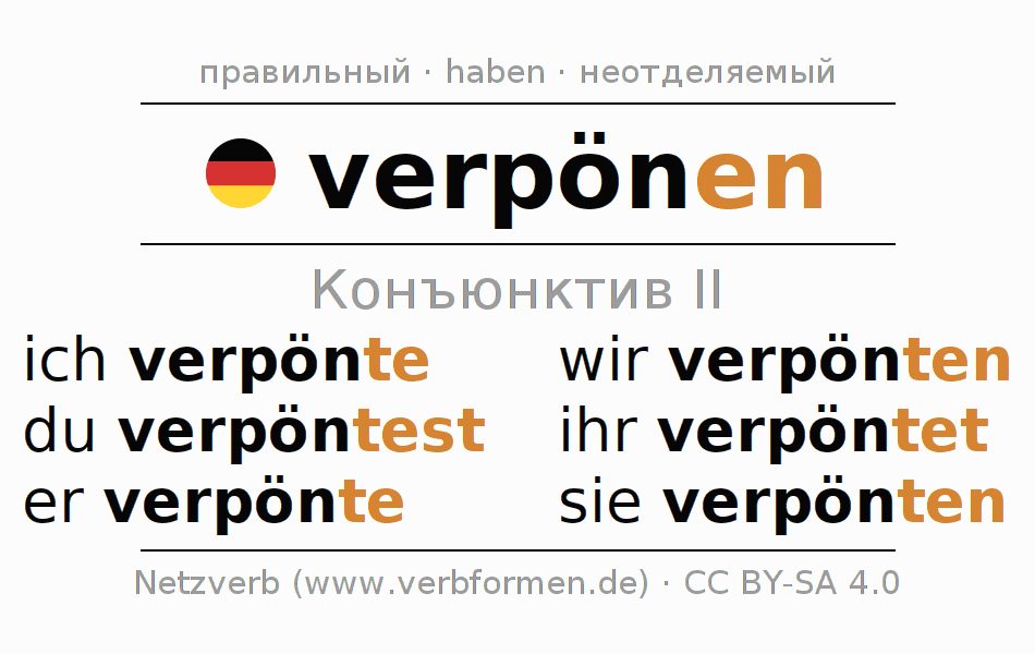 Спряжение verpönen (осуждать, запретить) в сослагательном наклонении II: ich verpönte, du verpöntest, er verpönte, wir verpönten, ihr verpöntet, sie verpönten