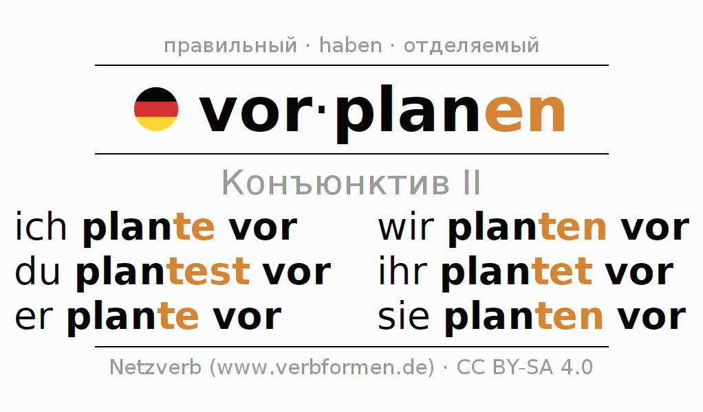 Спряжение vorplanen (предварительное планирование) в сослагательном наклонении II: ich plante vor, du plantest vor, er plante vor, wir planten vor, ihr plantet vor, sie planten vor