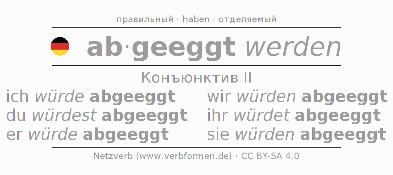Спряжение abeggen в Koнъюнктив Претеритум Сослагательное наклонение Пассив с werden: ich würde abgeeggt, du würdest abgeeggt, er würde abgeeggt, wir würden abgeeggt, ihr würdet abgeeggt, sie würden abgeeggt.Образование этих форм происходит по определённым грамматическим правилам. Так же спрягаются простые глагольные формы abeggen в Конъюнктив II. Kомментарии ☆