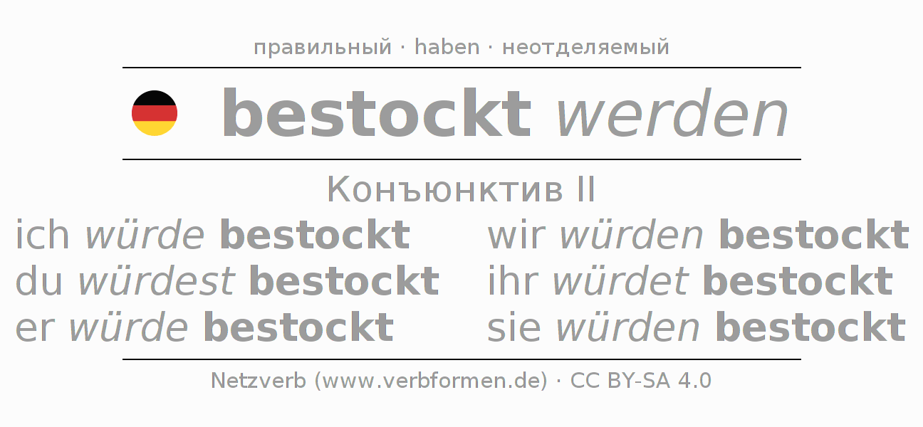 Спряжение bestocken в Koнъюнктив Претеритум Сослагательное наклонение Пассив с werden: ich würde bestockt, du würdest bestockt, er würde bestockt, wir würden bestockt, ihr würdet bestockt, sie würden bestockt.Образование этих форм происходит по определённым грамматическим правилам. Так же спрягаются простые глагольные формы bestocken в Конъюнктив II. Kомментарии ☆