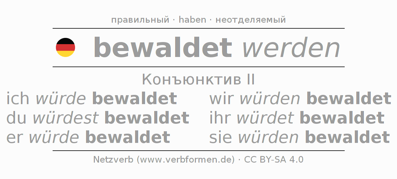 Спряжение bewalden в Koнъюнктив Претеритум Сослагательное наклонение Пассив с werden: ich würde bewaldet, du würdest bewaldet, er würde bewaldet, wir würden bewaldet, ihr würdet bewaldet, sie würden bewaldet.Образование этих форм происходит по определённым грамматическим правилам. Так же спрягаются простые глагольные формы bewalden в Конъюнктив II. Kомментарии ☆