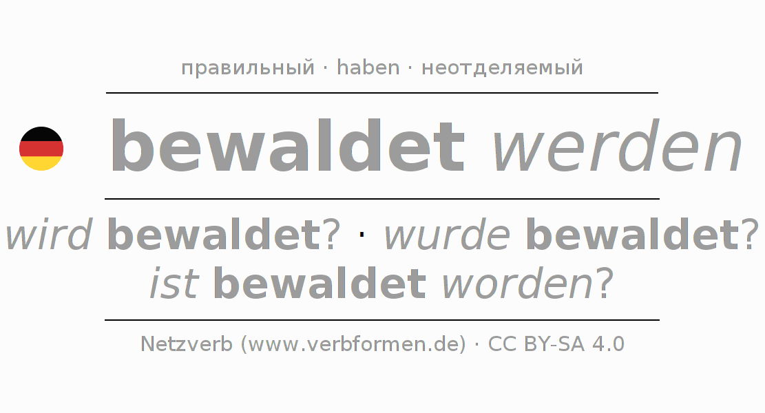 Спряжение bewalden в Koнъюнктив Претеритум Сослагательное наклонение Пассив с werden: würde ich bewaldet?, würdest du bewaldet?, würde er bewaldet?, würden wir bewaldet?, würdet ihr bewaldet?, würden sie bewaldet?.Образование этих форм происходит по определённым грамматическим правилам. Так же спрягаются простые глагольные формы bewalden в Конъюнктив II. Kомментарии ☆