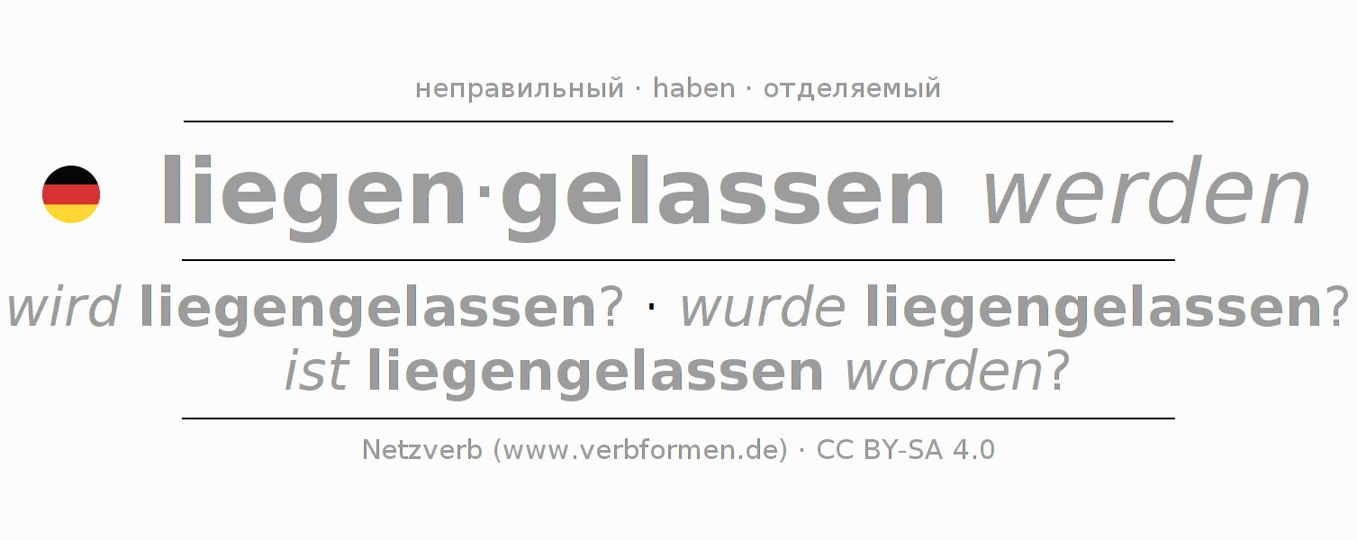 Спряжение liegenlassen в Koнъюнктив Претеритум Сослагательное наклонение Пассив с werden: würde ich liegengelassen?, würdest du liegengelassen?, würde er liegengelassen?, würden wir liegengelassen?, würdet ihr liegengelassen?, würden sie liegengelassen?.Образование этих форм происходит по определённым грамматическим правилам. Так же спрягаются простые глагольные формы liegenlassen в Конъюнктив II. Kомментарии ☆