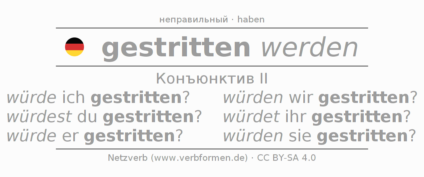 Спряжение streiten в Koнъюнктив Претеритум Сослагательное наклонение Пассив с werden: würde ich gestritten?, würdest du gestritten?, würde er gestritten?, würden wir gestritten?, würdet ihr gestritten?, würden sie gestritten?.Образование этих форм происходит по определённым грамматическим правилам. Так же спрягаются простые глагольные формы streiten в Конъюнктив II. Kомментарии ☆