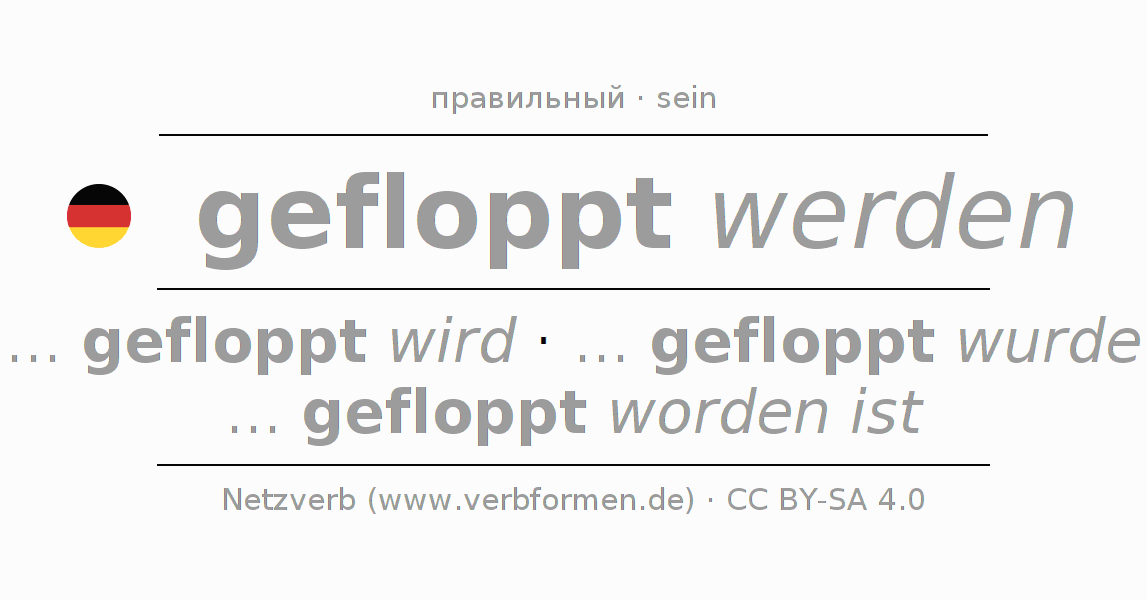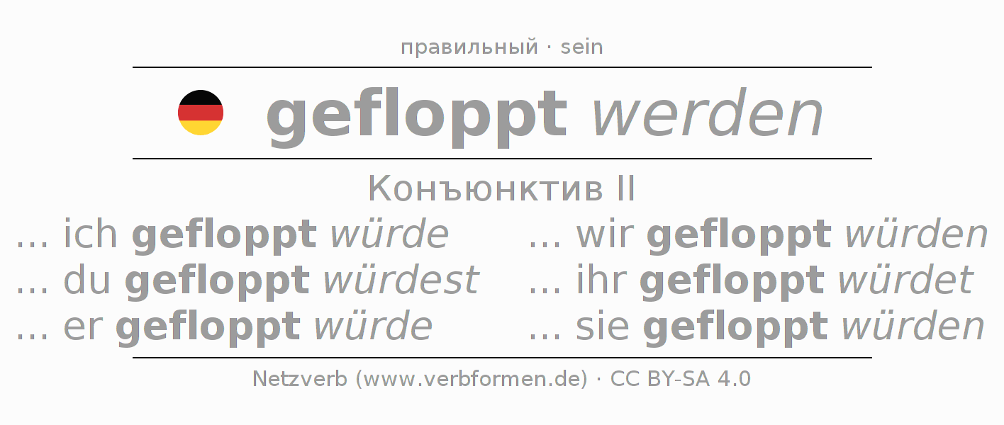 Спряжение floppen в Koнъюнктив Претеритум Сослагательное наклонение Пассив с werden: ... ich gefloppt würde, ... du gefloppt würdest, ... er gefloppt würde, ... wir gefloppt würden, ... ihr gefloppt würdet, ... sie gefloppt würden.Образование этих форм происходит по определённым грамматическим правилам. Так же спрягаются простые глагольные формы floppen в Конъюнктив II. Kомментарии ☆