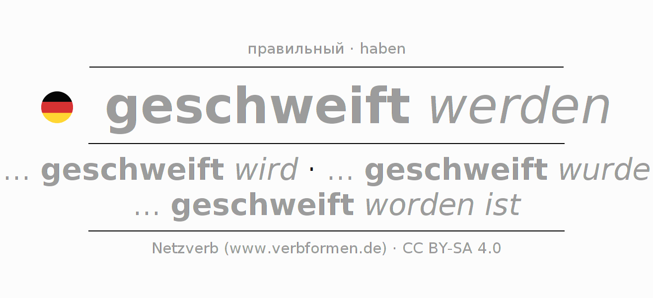 Спряжение schweifen в Koнъюнктив Претеритум Сослагательное наклонение Пассив с werden: ... ich geschweift würde, ... du geschweift würdest, ... er geschweift würde, ... wir geschweift würden, ... ihr geschweift würdet, ... sie geschweift würden.Образование этих форм происходит по определённым грамматическим правилам. Так же спрягаются простые глагольные формы schweifen в Конъюнктив II. Kомментарии ☆