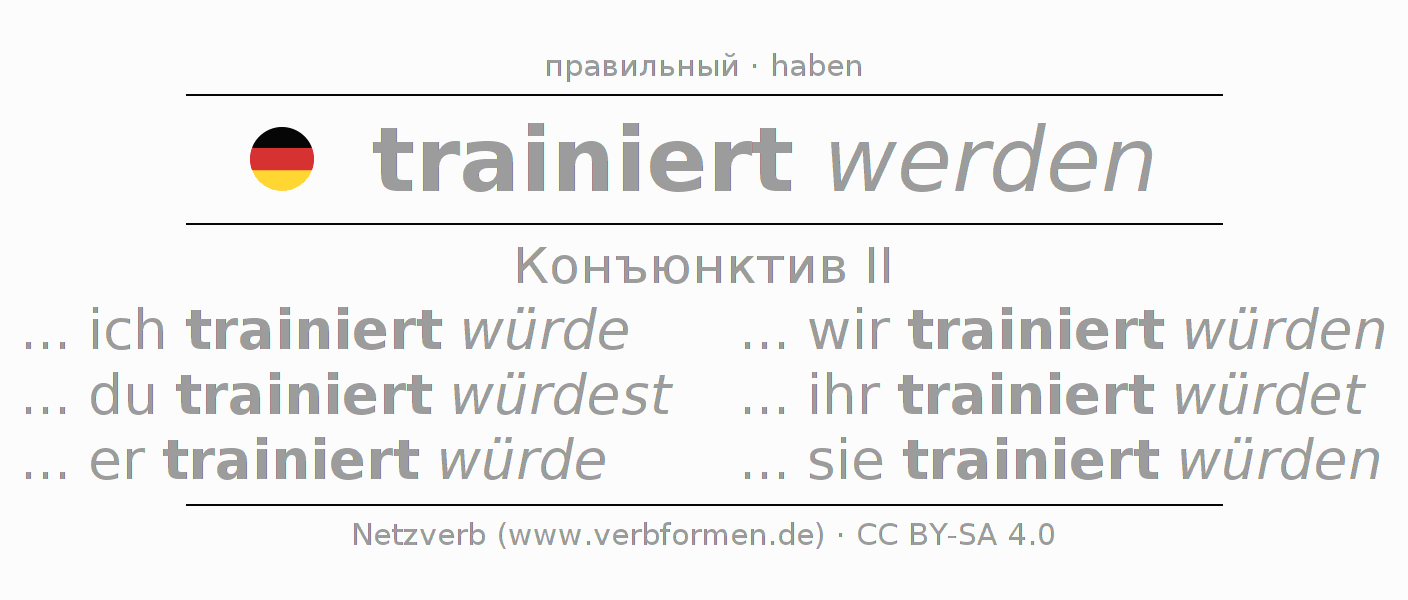 Спряжение trainieren в Koнъюнктив Претеритум Сослагательное наклонение Пассив с werden: ... ich trainiert würde, ... du trainiert würdest, ... er trainiert würde, ... wir trainiert würden, ... ihr trainiert würdet, ... sie trainiert würden.Образование этих форм происходит по определённым грамматическим правилам. Так же спрягаются простые глагольные формы trainieren в Конъюнктив II. Kомментарии ☆