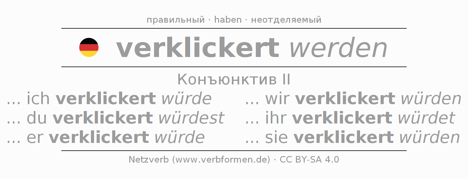 Спряжение verklickern в Koнъюнктив Претеритум Сослагательное наклонение Пассив с werden: ... ich verklickert würde, ... du verklickert würdest, ... er verklickert würde, ... wir verklickert würden, ... ihr verklickert würdet, ... sie verklickert würden.Образование этих форм происходит по определённым грамматическим правилам. Так же спрягаются простые глагольные формы verklickern в Конъюнктив II. Kомментарии ☆