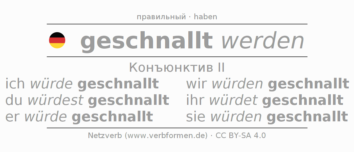 Спряжение schnallen в Koнъюнктив Претеритум Сослагательное наклонение Пассив с werden: ich würde geschnallt, du würdest geschnallt, er würde geschnallt, wir würden geschnallt, ihr würdet geschnallt, sie würden geschnallt.Образование этих форм происходит по определённым грамматическим правилам. Так же спрягаются простые глагольные формы schnallen в Конъюнктив II. Kомментарии ☆