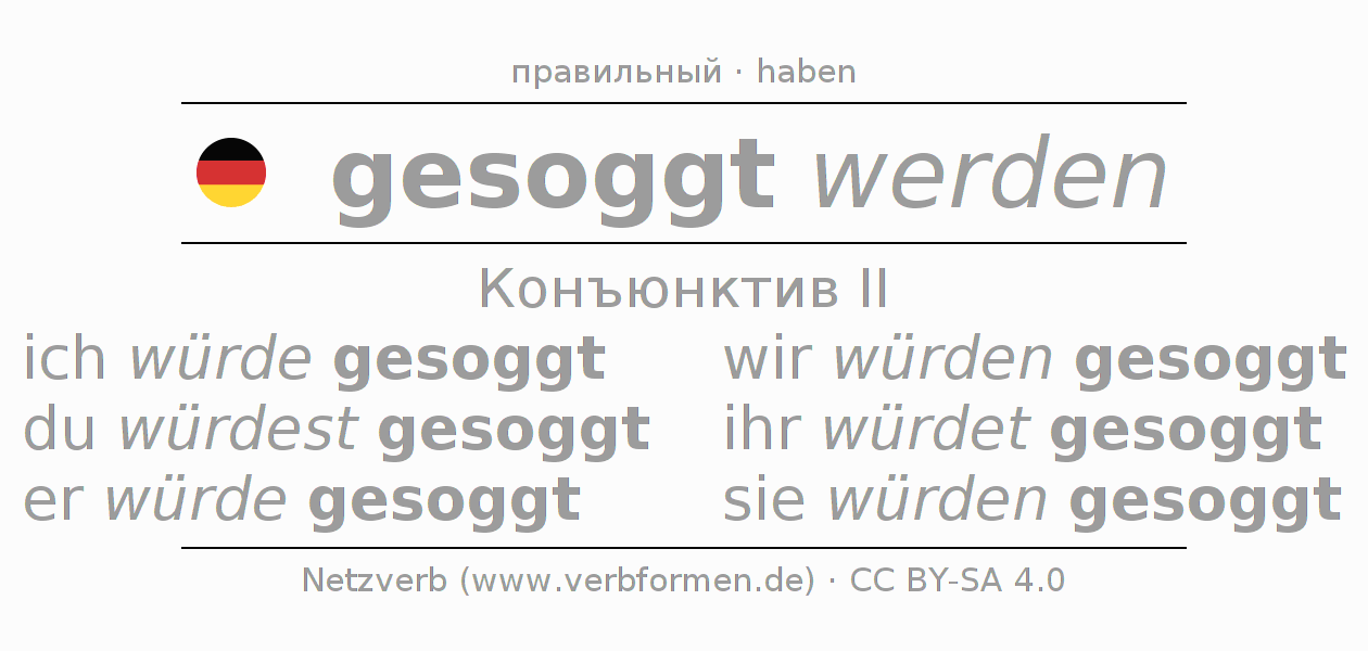 Спряжение soggen в Koнъюнктив Претеритум Сослагательное наклонение Пассив с werden: ich würde gesoggt, du würdest gesoggt, er würde gesoggt, wir würden gesoggt, ihr würdet gesoggt, sie würden gesoggt.Образование этих форм происходит по определённым грамматическим правилам. Так же спрягаются простые глагольные формы soggen в Конъюнктив II. Kомментарии ☆