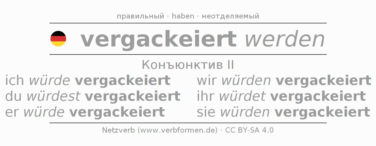Спряжение vergackeiern в Koнъюнктив Претеритум Сослагательное наклонение Пассив с werden: ich würde vergackeiert, du würdest vergackeiert, er würde vergackeiert, wir würden vergackeiert, ihr würdet vergackeiert, sie würden vergackeiert.Образование этих форм происходит по определённым грамматическим правилам. Так же спрягаются простые глагольные формы vergackeiern в Конъюнктив II. Kомментарии ☆