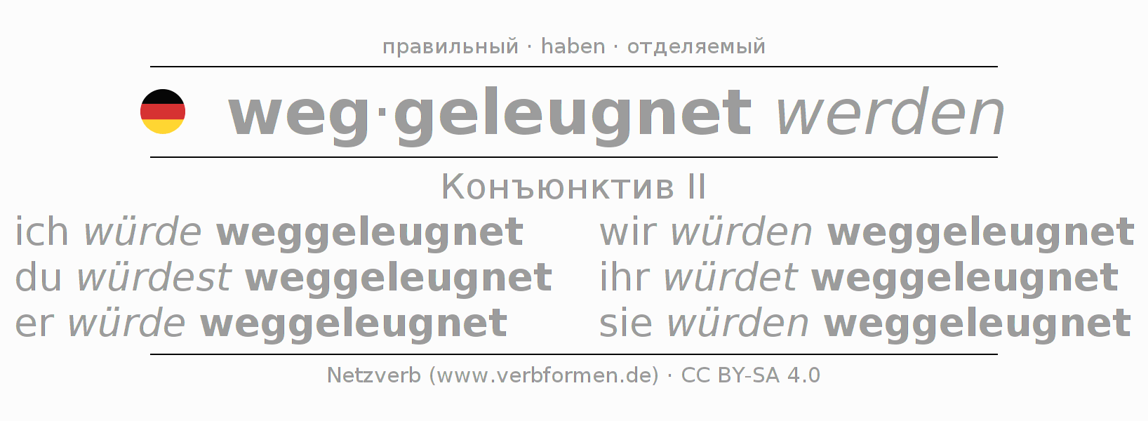 Спряжение wegleugnen в Koнъюнктив Претеритум Сослагательное наклонение Пассив с werden: ich würde weggeleugnet, du würdest weggeleugnet, er würde weggeleugnet, wir würden weggeleugnet, ihr würdet weggeleugnet, sie würden weggeleugnet.Образование этих форм происходит по определённым грамматическим правилам. Так же спрягаются простые глагольные формы wegleugnen в Конъюнктив II. Kомментарии ☆