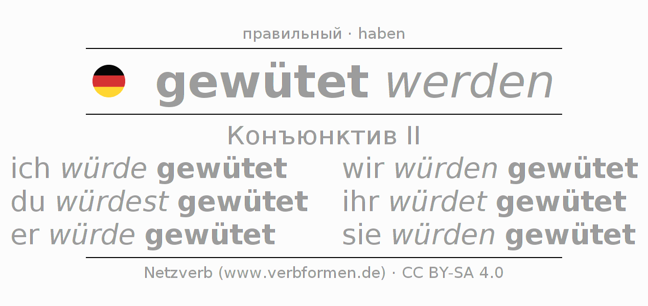 Спряжение wüten в Koнъюнктив Претеритум Сослагательное наклонение Пассив с werden: ich würde gewütet, du würdest gewütet, er würde gewütet, wir würden gewütet, ihr würdet gewütet, sie würden gewütet.Образование этих форм происходит по определённым грамматическим правилам. Так же спрягаются простые глагольные формы wüten в Конъюнктив II. Kомментарии ☆