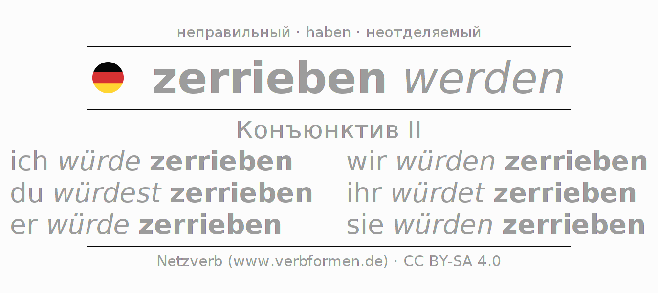 Спряжение zerreiben в Koнъюнктив Претеритум Сослагательное наклонение Пассив с werden: ich würde zerrieben, du würdest zerrieben, er würde zerrieben, wir würden zerrieben, ihr würdet zerrieben, sie würden zerrieben.Образование этих форм происходит по определённым грамматическим правилам. Так же спрягаются простые глагольные формы zerreiben в Конъюнктив II. Kомментарии ☆
