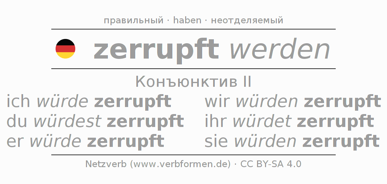 Спряжение zerrupfen в Koнъюнктив Претеритум Сослагательное наклонение Пассив с werden: ich würde zerrupft, du würdest zerrupft, er würde zerrupft, wir würden zerrupft, ihr würdet zerrupft, sie würden zerrupft.Образование этих форм происходит по определённым грамматическим правилам. Так же спрягаются простые глагольные формы zerrupfen в Конъюнктив II. Kомментарии ☆