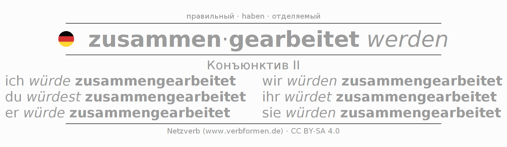 Спряжение zusammenarbeiten в Koнъюнктив Претеритум Сослагательное наклонение Пассив с werden: ich würde zusammengearbeitet, du würdest zusammengearbeitet, er würde zusammengearbeitet, wir würden zusammengearbeitet, ihr würdet zusammengearbeitet, sie würden zusammengearbeitet.Образование этих форм происходит по определённым грамматическим правилам. Так же спрягаются простые глагольные формы zusammenarbeiten в Конъюнктив II. Kомментарии ☆