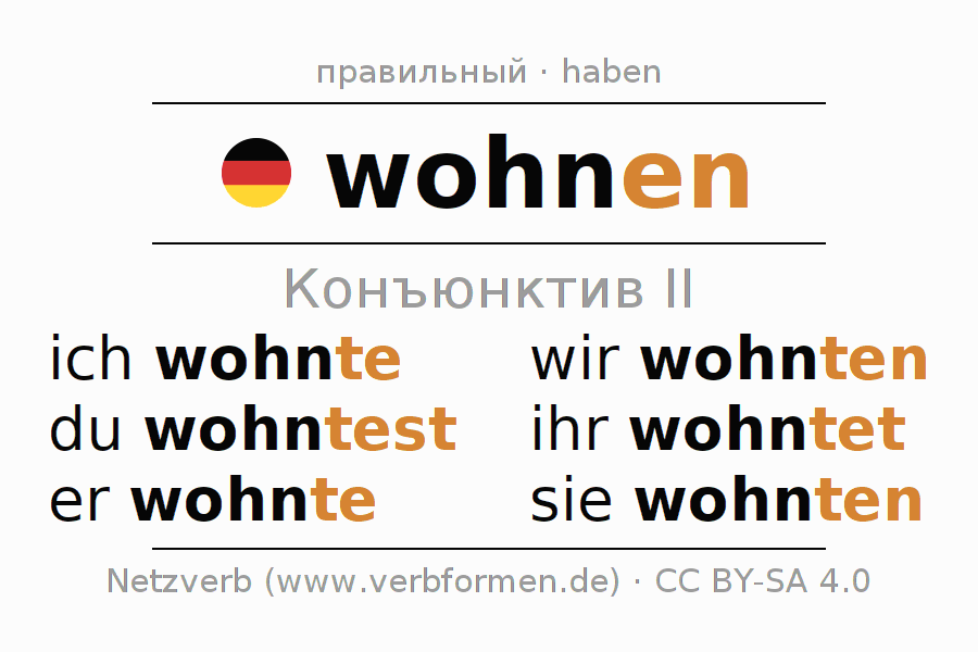 Спряжение wohnen (жить, проживать) в сослагательном наклонении II: ich wohnte, du wohntest, er wohnte, wir wohnten, ihr wohntet, sie wohnten