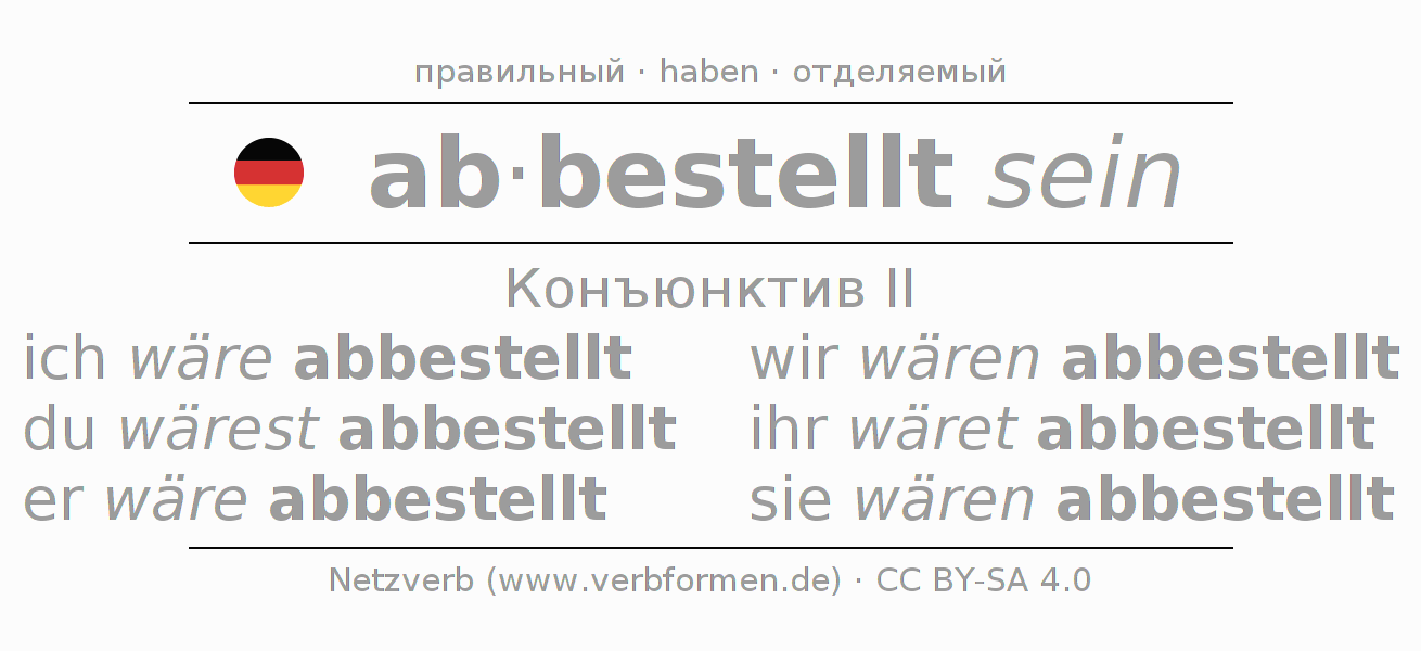 Спряжение abbestellen в Koнъюнктив Претеритум Сослагательное наклонение Пассив с sein: ich wäre abbestellt, du wärest abbestellt, er wäre abbestellt, wir wären abbestellt, ihr wäret abbestellt, sie wären abbestellt.Образование этих форм происходит по определённым грамматическим правилам. Так же спрягаются простые глагольные формы abbestellen в Конъюнктив II. Kомментарии ☆