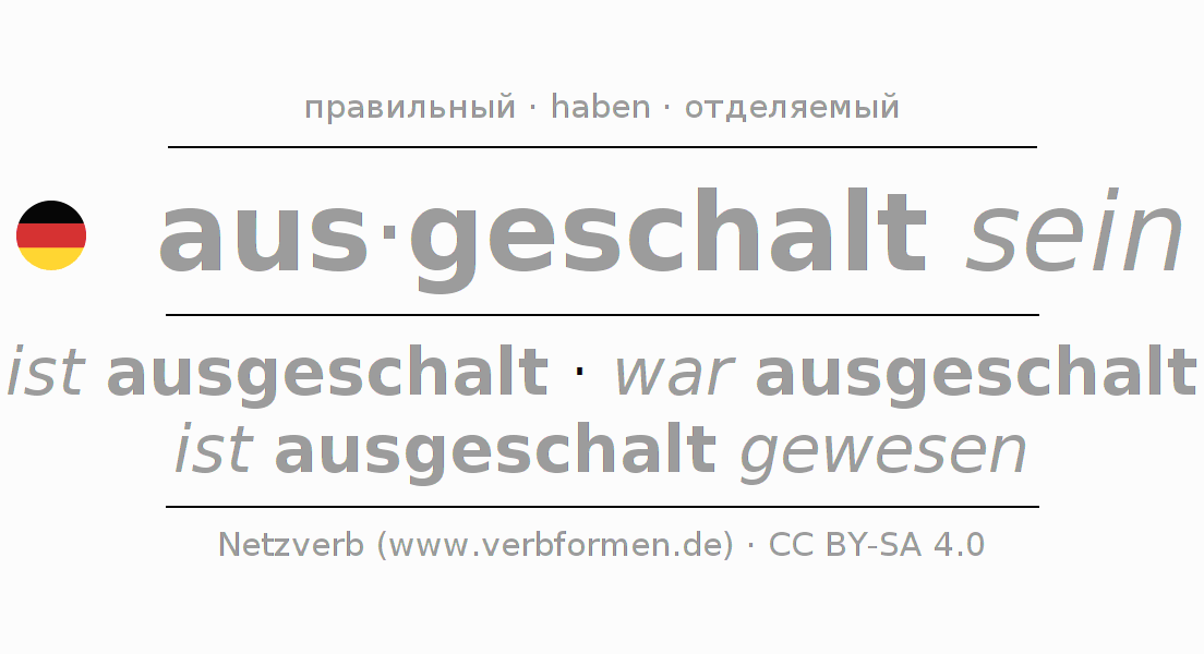 Спряжение ausschalen в Koнъюнктив Претеритум Сослагательное наклонение Пассив с sein: ich wäre ausgeschalt, du wärest ausgeschalt, er wäre ausgeschalt, wir wären ausgeschalt, ihr wäret ausgeschalt, sie wären ausgeschalt.Образование этих форм происходит по определённым грамматическим правилам. Так же спрягаются простые глагольные формы ausschalen в Конъюнктив II. Kомментарии ☆