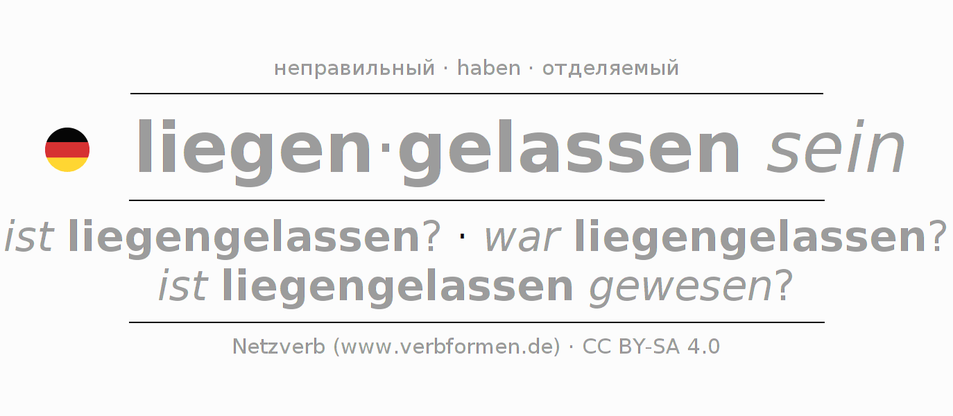 Спряжение liegenlassen в Koнъюнктив Претеритум Сослагательное наклонение Пассив с sein: wäre ich liegengelassen?, wärest du liegengelassen?, wäre er liegengelassen?, wären wir liegengelassen?, wäret ihr liegengelassen?, wären sie liegengelassen?.Образование этих форм происходит по определённым грамматическим правилам. Так же спрягаются простые глагольные формы liegenlassen в Конъюнктив II. Kомментарии ☆