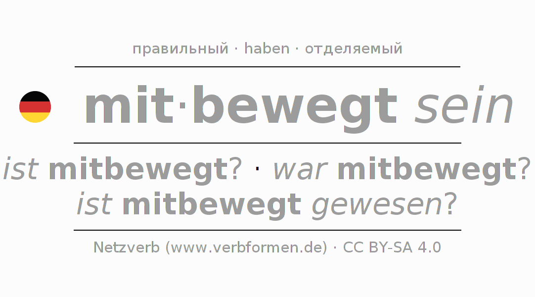 Спряжение mitbewegen в Koнъюнктив Претеритум Сослагательное наклонение Пассив с sein: wäre ich mitbewegt?, wärest du mitbewegt?, wäre er mitbewegt?, wären wir mitbewegt?, wäret ihr mitbewegt?, wären sie mitbewegt?.Образование этих форм происходит по определённым грамматическим правилам. Так же спрягаются простые глагольные формы mitbewegen в Конъюнктив II. Kомментарии ☆
