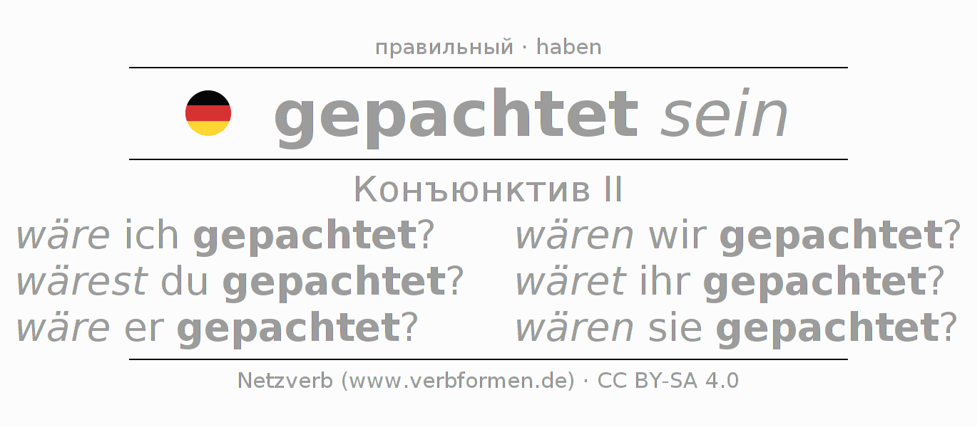 Спряжение pachten в Koнъюнктив Претеритум Сослагательное наклонение Пассив с sein: wäre ich gepachtet?, wärest du gepachtet?, wäre er gepachtet?, wären wir gepachtet?, wäret ihr gepachtet?, wären sie gepachtet?.Образование этих форм происходит по определённым грамматическим правилам. Так же спрягаются простые глагольные формы pachten в Конъюнктив II. Kомментарии ☆