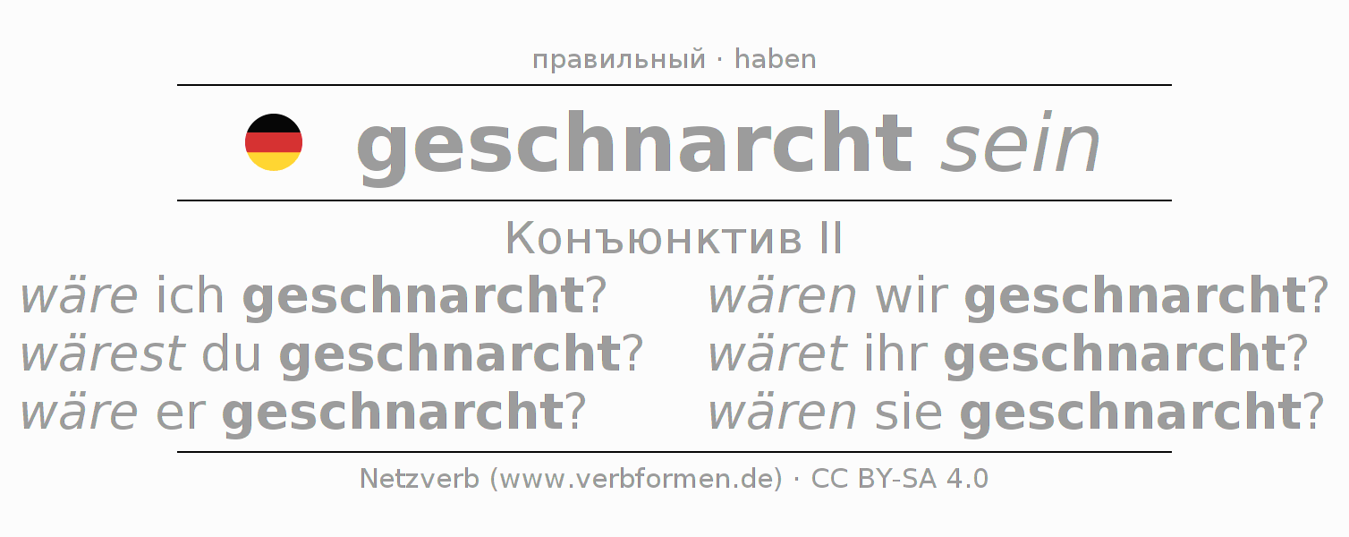 Спряжение schnarchen в Koнъюнктив Претеритум Сослагательное наклонение Пассив с sein: wäre ich geschnarcht?, wärest du geschnarcht?, wäre er geschnarcht?, wären wir geschnarcht?, wäret ihr geschnarcht?, wären sie geschnarcht?.Образование этих форм происходит по определённым грамматическим правилам. Так же спрягаются простые глагольные формы schnarchen в Конъюнктив II. Kомментарии ☆