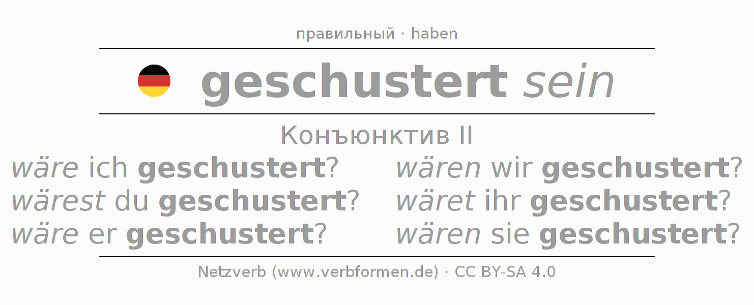 Спряжение schustern в Koнъюнктив Претеритум Сослагательное наклонение Пассив с sein: wäre ich geschustert?, wärest du geschustert?, wäre er geschustert?, wären wir geschustert?, wäret ihr geschustert?, wären sie geschustert?.Образование этих форм происходит по определённым грамматическим правилам. Так же спрягаются простые глагольные формы schustern в Конъюнктив II. Kомментарии ☆