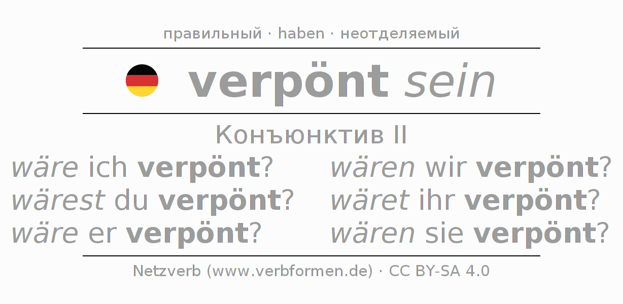Спряжение verpönen в Koнъюнктив Претеритум Сослагательное наклонение Пассив с sein: wäre ich verpönt?, wärest du verpönt?, wäre er verpönt?, wären wir verpönt?, wäret ihr verpönt?, wären sie verpönt?.Образование этих форм происходит по определённым грамматическим правилам. Так же спрягаются простые глагольные формы verpönen в Конъюнктив II. Kомментарии ☆