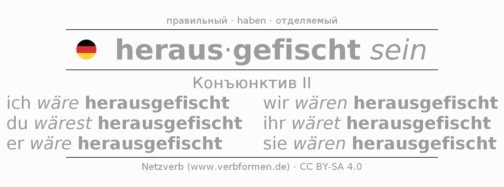 Спряжение herausfischen в Koнъюнктив Претеритум Сослагательное наклонение Пассив с sein: ich wäre herausgefischt, du wärest herausgefischt, er wäre herausgefischt, wir wären herausgefischt, ihr wäret herausgefischt, sie wären herausgefischt.Образование этих форм происходит по определённым грамматическим правилам. Так же спрягаются простые глагольные формы herausfischen в Конъюнктив II. Kомментарии ☆